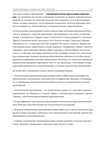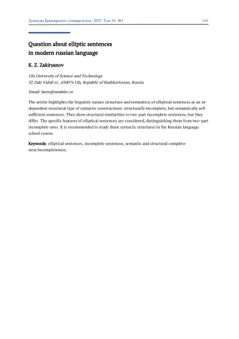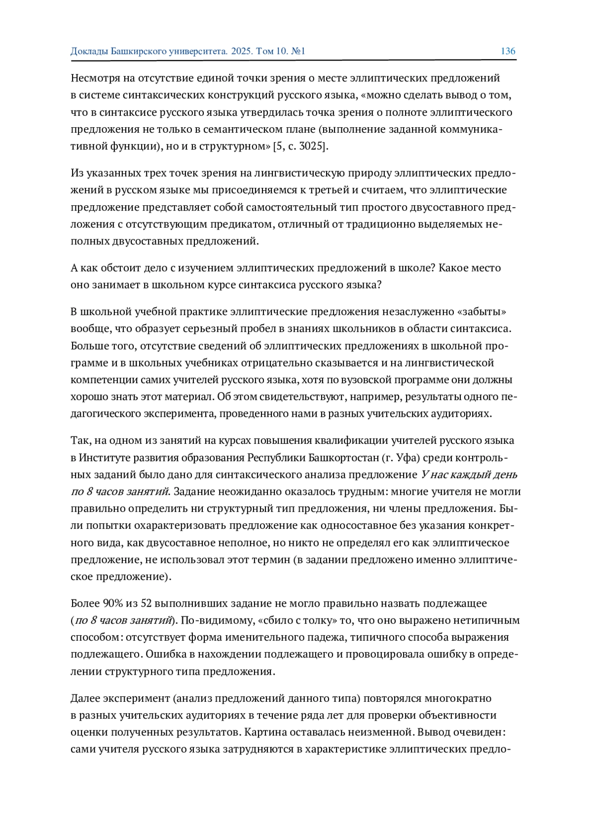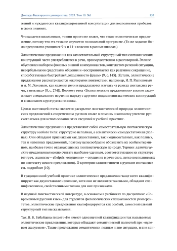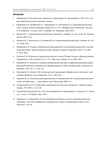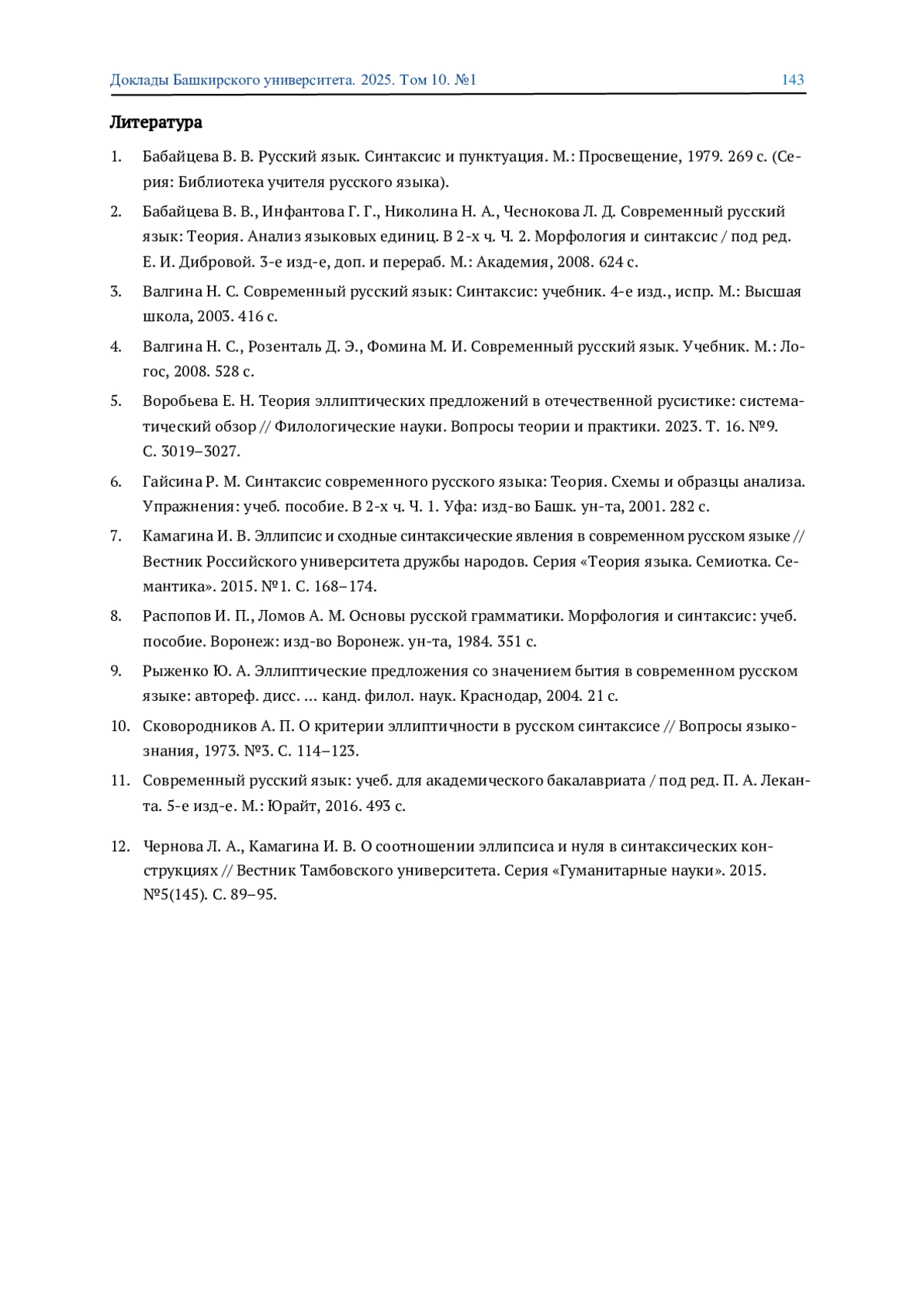 ЗАКИРЬЯНОВ К. З. ВОПРОС ОБ ЭЛЛИПТИЧЕСКИХ ПРЕДЛОЖЕНИЯХ В СОВРЕМЕННОМ РУССКОМ ЯЗЫКЕ // ДОКЛАДЫ БАШКИРСКОГО УНИВЕРСИТЕТА. 2025. Т. 10 № 1