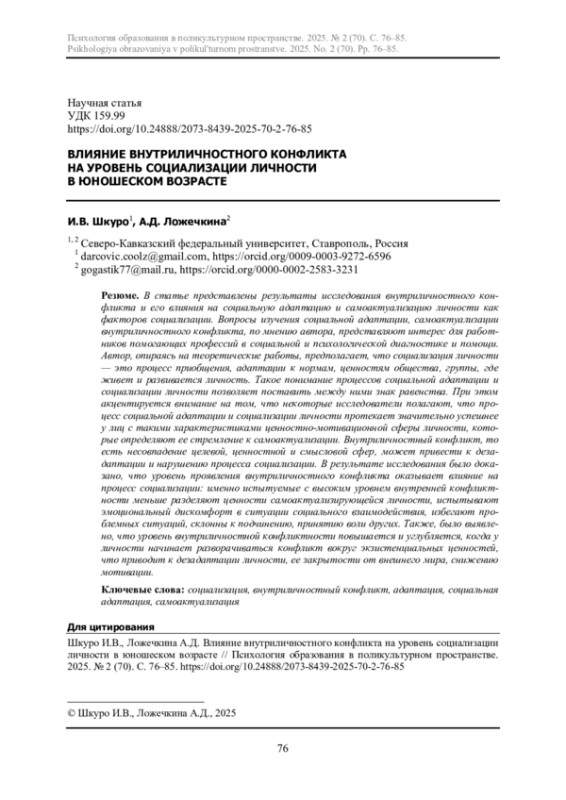 В статье представлены результаты исследования внутриличностного конфликта и его влияния на социальную адаптацию и самоактуализацию личности как факторов социализации. Вопросы изучения социальной адаптации, самоактуализации внутриличностного конфликта, по мнению автора, представляют интерес для работников помогающих профессий в социальной и психологической диагностике и помощи. Автор, опираясь на теоретические работы, предполагает, что социализация личности - это процесс приобщения, адаптации к нормам, ценностям общества, группы, где живет и развивается личность. Такое понимание процессов социальной адаптации и социализации личности позволяет поставить между ними знак равенства. При этом акцентируется внимание на том, что некоторые исследователи полагают, что процесс социальной адаптации и социализации личности протекает значительно успешнее у лиц с такими характеристиками ценностно-мотивационной сферы личности, которые определяют ее стремление к самоактуализации. Внутриличностный конфликт, то есть несовпадение целевой, ценностной и смысловой сфер, может привести к дезадаптации и нарушению процесса социализации. В результате исследования было доказано, что уровень проявления внутриличностного конфликта оказывает влияние на процесс социализации: именно испытуемые с высоким уровнем внутренней конфликтности меньше разделяют ценности самоактуализирующейся личности, испытывают эмоциональный дискомфорт в ситуации социального взаимодействия, избегают проблемных ситуаций, склонны к подчинению, принятию воли других. Также, было выявлено, что уровень внутриличностной конфликтности повышается и углубляется, когда у личности начинает разворачиваться конфликт вокруг экзистенциальных ценностей, что приводит к дезадаптации личности, ее закрытости от внешнего мира, снижению мотивации.
