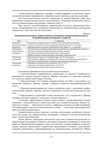 Статья посвящена теоретическому анализу роли конкурсной деятельности как инструмента самореализации иностранных учащихся на этапе довузовской подготовки. Актуальность исследования обусловлена ростом числа иностранных студентов в России (более 350 тыс. человек в 2023 г. по данным Министерства науки и высшего образования РФ) и необходимостью разработки педагогических стратегий, способствующих их интеграции в образовательное пространство через активизацию личностного и профессионального потенциала. В работе синтезируются ключевые концепции самореализации, включая теорию социального интереса А. Адлера и деятельностный подход К. А. Абульхановой-Славской, а также современные исследования мотивации (Е. Н. Легочкина) и межкультурной адаптации (Д. Н. Литвинова). Авторы раскрывают механизмы влияния конкурсных форматов на формирование академической, социальной и творческой идентичности учащихся, подчеркивая их роль в преодолении языковых барьеров, снижении ситуативной тревожности и развитии профессионального самоопределения. Теоретическая значимость работы заключается в систематизации педагогических принципов интеграции конкурсной деятельности, таких как: а) сочетание соревновательности и кооперации для баланса между мотивацией и сотрудничеством; б) ориентация на культурный плюрализм через проекты, соединяющие традиции стран учащихся и принимающего общества (например, межкультурные фестивали, хакатоны, квесты и др.). Практическая ценность исследования выражена в разработке рекомендаций по внедрению интерактивных методов. Например, использование геймифицированных форматов (онлайн-марафоны и др.) для повышения вовлеченности, внедрение тьюторской поддержки при подготовке конкурсных работ. Статья служит основой для дальнейших эмпирических исследований, направленных на оптимизацию образовательных траекторий иностранных учащихся в условиях глобализации высшей школы.
