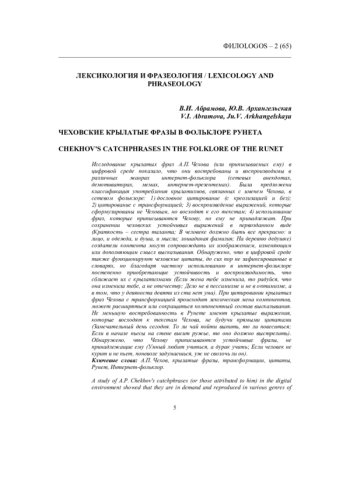 1. Абрамова В.И., Архангельская Ю.В. Пушкинские прецедентные высказывания в фольклоре Рунета // Филоlogos. 2023. № 4(59). С. 5-14.