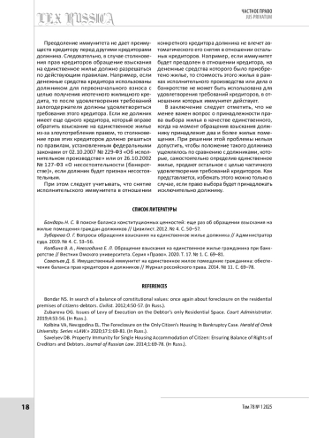1. Бондарь Н. С. В поиске баланса конституционных ценностей: еще раз об обращении взыскания на жилые помещения граждан-должников // Цивилист. 2012. № 4. С. 50-57.