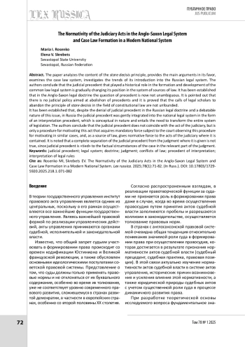 Анализируется содержание принципа stare decisis, выдвигаются основные аргументы в его пользу, рассматривается система прецедентного права, исследуются тенденции ее внедрения в российскую правовую систему. Сделаны выводы о том, что судебный прецедент, сыгравший историческую роль в формировании и развитии правовых систем общего права, постепенно меняет свое положение в системе источников. Установлено, что в англосаксонской правовой доктрине вопрос прецедента сейчас не является однозначным. Указано на отсутствие судебной политики в вопросе отмены прецедентов и доказывается, что призывы ученых отказаться от принципа stare decisis в сфере конституционного права небезосновательны. Установлено, что, несмотря на отрицание в российской правовой доктрине судебного прецедента и дискуссионность данного вопроса, в России судебный прецедент был мягко интегрирован в национальную правовую систему в форме прецедента толкования, что носит концептуальный характер и влечет за собой необходимость трансформации всей системы законодательства. Сделан вывод, что судебный прецедент не совпадает с актом судебной власти, а является лишь порядком мотивации этого акта, приобретающим обязательную силу при соблюдении судом этого порядка мотивации по аналогичным делам, и как источник права придает нормативную силу тем актам судебной власти, где он содержится. Отмечено, что не является верным полное отделение судебного прецедента от судебного решения, в котором он содержится, поскольку судебный прецедент привязан к фактическим обстоятельствам дела, изложенным в соответствующей части судебного решения.