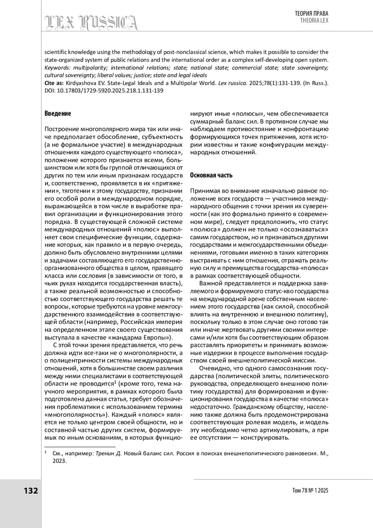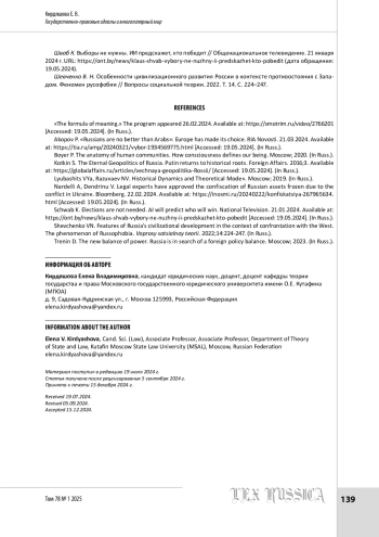 Построение многополярного мира требует от государства, претендующего на роль полюса, предложения конкурентоспособной модели общественного устройства и миропорядка, признаваемой как собственным населением, так и участниками международного общения. Эта модель должна опираться и отражать ту силу, которая позволяет государству претендовать на соответствующий статус, выигрышно отличает соответствующий «полюс» от прочих участников международного общения и способна обеспечить необходимое равновесие сложной системе международных отношений. В настоящее время в Российской Федерации указанная модель не артикулирована, хотя и обозначена политическим руководством страны. Имеющиеся трудности ее разработки обусловлены целым рядом причин. Одна из них — вопрос культурного суверенитета, другая — сложный самоорганизующийся характер системы общественных отношений. В статье обозначен ряд теоретико-правовых вопросов, на которые необходимо обратить внимание в процессе формирования соответствующей модели в современной России: язык юридической науки, государственно-правовые идеалы, включая понятие справедливости, и т. д. Подчеркивается также, что разработка модели должна осуществляться специалистами различных направлений научного знания с привлечением методологии постнеклассической науки, позволяющей рассматривать государственно-организованную систему общественных отношений и международный порядок как сложную саморазвивающуюся открытую систему.