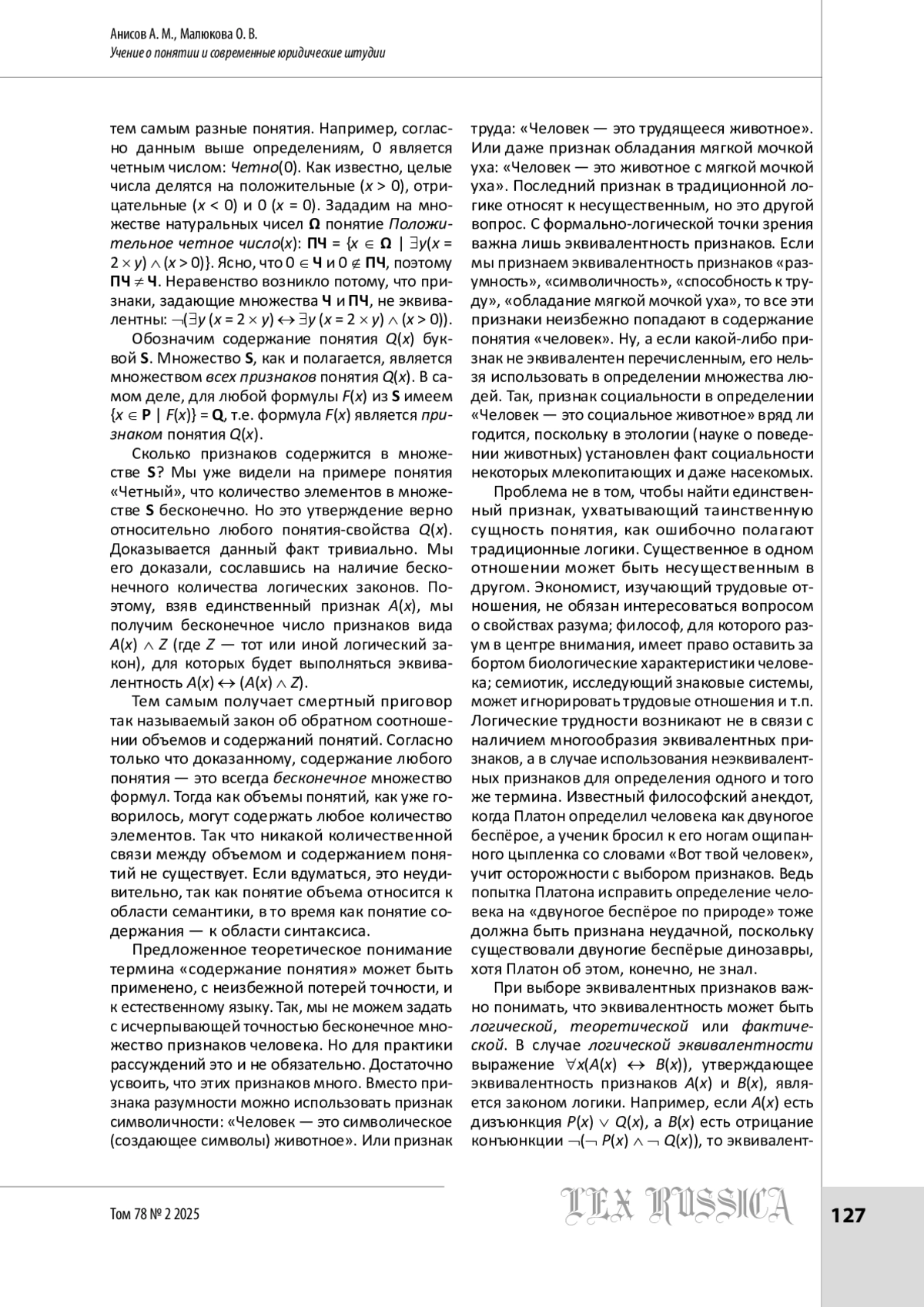В современных юридических исследованиях активно используется логическая информация устаревшего типа. В статье показано, что традиционная логика в принципе не способна к адекватному анализу понятий-отношений, что резко сужает ее возможности. В ходе исследования было установлено, что любое понятие не является мыслью об объекте, а представляет собой свойство или отношение, т. е. n-местный предикат. Следовательно, деление понятий на конкретные и абстрактные лишено смысла. Представление о содержании понятия — самое слабое место традиционной логики, ибо вопросы о составе содержания, количестве признаков содержания даже не ставятся. В статье доказывается, что содержание любого понятия — это всегда бесконечное множество формул (признаков). И поскольку объемы понятий могут содержать любое количество элементов, то никакой количественной связи между объемом и содержанием понятий не существует, что представляет собой не критику закона об обратном отношении, а его отрицание. Проведенный средствами современной логики анализ учения о понятии существенно расширяет возможности как обыденной, так и научной практики, в частности современных юридических изысканий.
