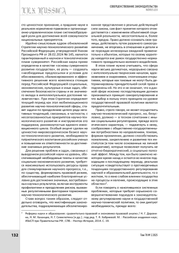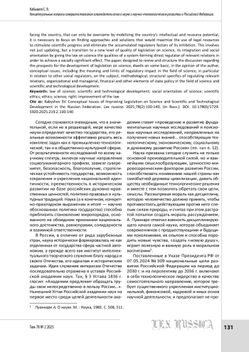 Наука и научно-технологическое развитие являются сегодня ключевым фактором обеспечения суверенитета, безопасности и благополучия государства, создания условий для достойной жизни граждан. С учетом стоящих перед страной исторических вызовов, преодолеть которые возможно только путем мобилизации интеллектуального и ресурсного потенциала страны, необходимо сфокусироваться на поиске подходов и решений, которые позволили бы максимально задействовать ресурсы права для стимулирования научного прогресса, устранить накопившиеся регулятивные факторы его торможения. Это предполагает не просто актуализацию, а переход к новому уровню качества законодательства о науке, его интеграцию и социальную ориентацию через придание закону о науке качеств системообразующего непосредственного регулятора соответствующих отношений в целях достижения общественно значимого эффекта. В статье, призванной оживить и структурировать дискуссию относительно перспектив развития законодательства о науке, ставятся на обсуждение некоторые основные, на взгляд автора — концептуальные, вопросы, в том числе о смысле и пределах нормативно-правового воздействия в сфере науки, в частности в соотношении с иными социальными регуляторами, о предметной, методологической, структурной специфике регулирования соответствующих отношений, организационно-управленческих, финансовых и иных составляющих государственной политики в области науки и научно-технологического развития.