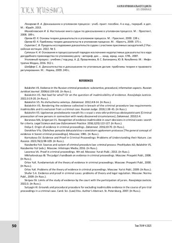 БАЛАКШИН В. С. К ВОПРОСУ ОБ ОСОБОМ СТАТУСЕ ПОСТАНОВЛЕНИЙ СУДЬИ О ПРИЗНАНИИ ДОКАЗАТЕЛЬСТВ НЕДОПУСТИМЫМИ И О ПРОБЛЕМАХ ПРОВЕРКИ ИХ ЗАКОННОСТИ И ОБОСНОВАННОСТИ // LEX RUSSICA (РУССКИЙ ЗАКОН). 2025. ТОМ 78, № 4