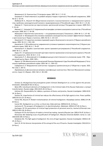 8. Иванов Н. Г., Косырев И. И. Современный метаморфоз уголовно наказуемого хулиганства // Российская юстиция. 2008. № 1. С. 34-38.