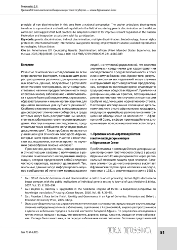 Статья посвящена детальному анализу реализации принципа недискриминации по признаку генетического статуса в рамках Африканского Союза, а также его государств-членов. Автором рассмотрены правовые основы противодействия генетической дискриминации в контексте ведущего регионального интеграционного объединения на Африканском континенте, исследованы ключевые наднациональные механизмы защиты от дискриминации. Особое внимание в исследовании уделено комплексному обзору опыта государств — членов Африканского Союза в части противодействия дискриминационным и стигматизирующим практикам. Опыт Малави, Южно-Африканской Республики, Судана демонстрирует не только приверженность концептуальным подходам в отношении запрета на генетическую дискриминацию, сложившимся на глобальном уровне, но и возможности реализации принципа недискриминации в рассматриваемой сфере в национальном разрезе. Автором сформулированы тенденции развития наднационального и национального регулирования в области противодействия генетической дискриминации на Африканском континенте, предложена рецепция лучших практик для совершенствования релевантной регуляторики в Российской Федерации и интеграционных объединениях с ее участием.