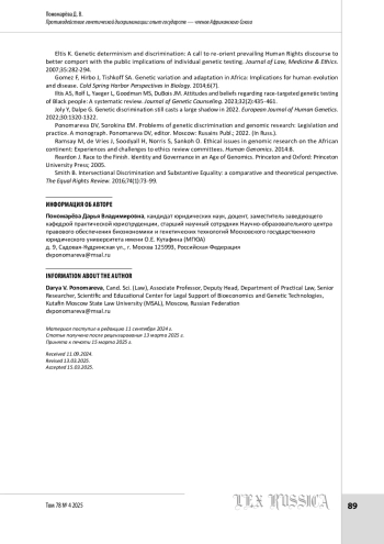 1. Пономарева Д. В., Сорокина Е. М. Проблемы генетической дискриминации и геномные исследования: законодательство и практика : монография / под ред. Д. В. Пономаревой. М. : Русайнс, 2022. 105 с.
