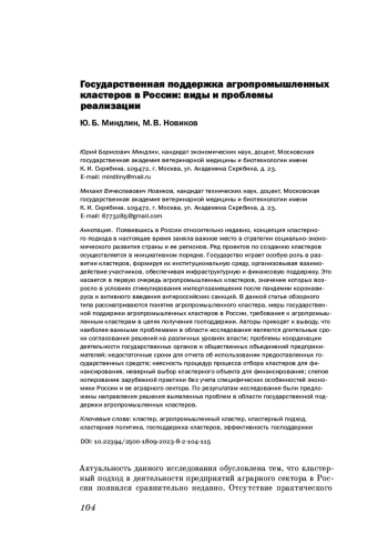 Появившись в России относительно недавно, концепция кластерного подхода в настоящее время заняла важное место в стратегии социально-экономического развития страны и ее регионов. Ряд проектов по созданию кластеров осуществляется в инициативном порядке. Государство играет особую роль в развитии кластеров, формируя их институциональную среду, организовывая взаимодействие участников, обеспечивая инфраструктурную и финансовую поддержку. Это касается в первую очередь агропромышленных кластеров, значение которых возросло в условиях стимулирования импортозамещения после пандемии коронавируса и активного введения антироссийских санкций. В данной статье обзорного типа рассматриваются понятие агропромышленного кластера, меры государственной поддержки агропромышленных кластеров в России, требования к агропромышленным кластерам в целях получения господдержки. Авторы приходят к выводу, что наиболее важными проблемами в области исследования являются длительные сроки согласования решений на различных уровнях власти; проблемы координации деятельности государственных органов и общественных объединений предпринимателей; недостаточные сроки для отчета об использовании предоставленных государственных средств; неясность процедур процесса отбора кластеров для финансирования, неверный выбор кластерного объекта для финансирования; слепое копирование зарубежной практики без учета специфических особенностей экономики России и ее аграрного сектора. По результатам исследования были предложены направления решения выявленных проблем в области государственной поддержки агропромышленных кластеров.