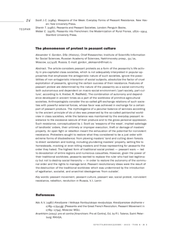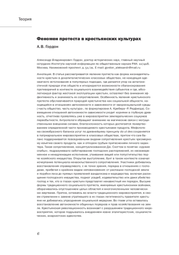 В статье рассматривается явление протеста как форма жизнедеятельности крестьян в докапиталистических классовых обществах, не находящая адекватного истолкования в популярных подходах, где делается упор на антагонистичной природе этих обществ и игнорируются возможности сбалансирования противоречий в контексте социального взаимодействия субъектов и где, абсолютизируя фактор жестокой эксплуатации крестьян, оставляют без внимания эффективность и значимость их сопротивления. Особенность явления крестьянского протеста обуславливается природой крестьянства как социальной общности, находящейся в отношениях автономности и зависимости от макросоциальной среды («часть-общество, часть-культура», по формулировке А. Кребера-Р. Редфилда). Совмещение отношений автономности-зависимости уходит корнями в глубокую древность, отчетливо проявляясь уже в мировосприятии земледельческих социумов первобытности. Антропологи обращают внимание на магические связи с могущественными внешними силами, благосклонность которых достигается пожертвованием определенной части производимого крестьянами продукта. Мифологема своеобразного баланса услуг по древнейшему принципу do ut des сохраняется в патриархальном мировосприятии в классовых обществах, притом что сам баланс поддерживается повседневными видами сопротивления крестьян чрезмерному изъятию своего продукта, как и отпором грубым притеснениям личного характера. Такое сопротивление, концептуализованное Дж. Скоттом в понятии «оружие слабых», подразумевало саботирование господских распоряжений, их несвоевременное и ненадлежащее исполнение, утаивание вещей или попустительство порче хозяйского имущества. Открытое выступление, бунт в таком контексте означал исчерпание потенциала ненасильственного сопротивления. Участники добивались восстановления справедливого, с их точки зрения, порядка в отношениях с господами, прибегая к крайним видам неповиновения: от распашки господской земли и порубки леса до прямых проявлений вандализма и мародерства, включая расхищение господского имущества, поджог усадеб, издевательство или даже убийство господ и тех, кто в глазах крестьян представлял ненавистный им порядок. Высшие формы традиционного социального протеста, именуемые крестьянскими войнами, оборачивались опустошением целых областей и многочисленными человеческими жертвами. Притом, оставаясь во власти традиционного мировосприятия, в своем стремлении к замене утратившего в их глазах легитимность правителя крестьяне не добивались упразднения социальной иерархии. Во главе угла оставалось восстановление автономности общинных порядков и прав хозяйствования на земле. Крестьянская революционность возникает с разрушением традиционного мировосприятия, которое подрывалось внедрением извне эгалитаристских, социалистических, анархистских идеологем.
