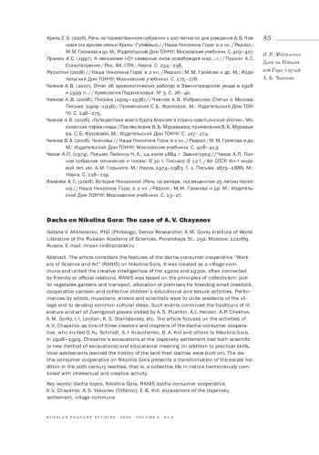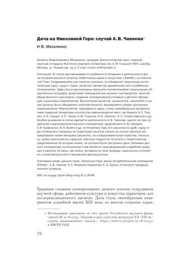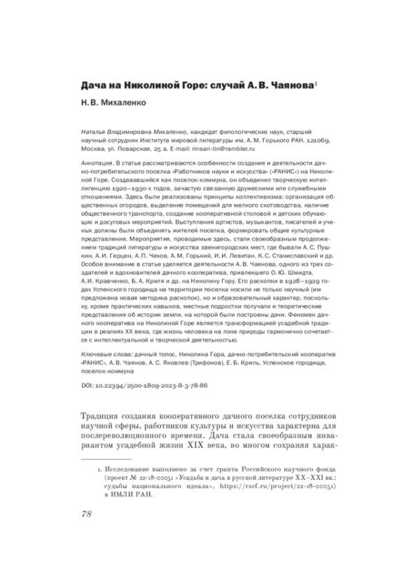 В статье рассматриваются особенности создания и деятельности дачно-потребительского поселка «Работников науки и искусства» («РАНИС») на Николиной Горе. Создававшийся как поселок-коммуна, он объединил творческую интеллигенцию 1920-1930-х годов, зачастую связанную дружескими или служебными отношениями. Здесь были реализованы принципы коллективизма: организация общественных огородов, выделение помещений для мелкого скотоводства, наличие общественного транспорта, создание кооперативной столовой и детских обучающих и досуговых мероприятий. Выступления артистов, музыкантов, писателей и ученых должны были объединять жителей поселка, формировать общие культурные представления. Мероприятия, проводимые здесь, стали своеобразным продолжением традиций литературы и искусства звенигородских мест, где бывали А. С. Пушкин, А. И. Герцен, А. П. Чехов, А. М. Горький, И. И. Левитан, К. С. Станиславский и др. Особое внимание в статье уделяется деятельности А. В. Чаянова, одного из трех создателей и вдохновителей дачного кооператива, привлекшего О. Ю. Шмидта, А. И. Кравченко, Б. А. Криля и др. на Николину Гору. Его раскопки в 1928-1929 годах Успенского городища на территории поселка носили не только научный (им предложена новая методика раскопок), но и образовательный характер, поскольку, кроме практических навыков, местные подростки получали и теоретические представления об истории земли, на которой были построены дачи. Феномен дачного кооператива на Николиной Горе является трансформацией усадебной традиции в реалиях XX века, где жизнь человека на лоне природы гармонично сочетается с интеллектуальной и творческой деятельностью.