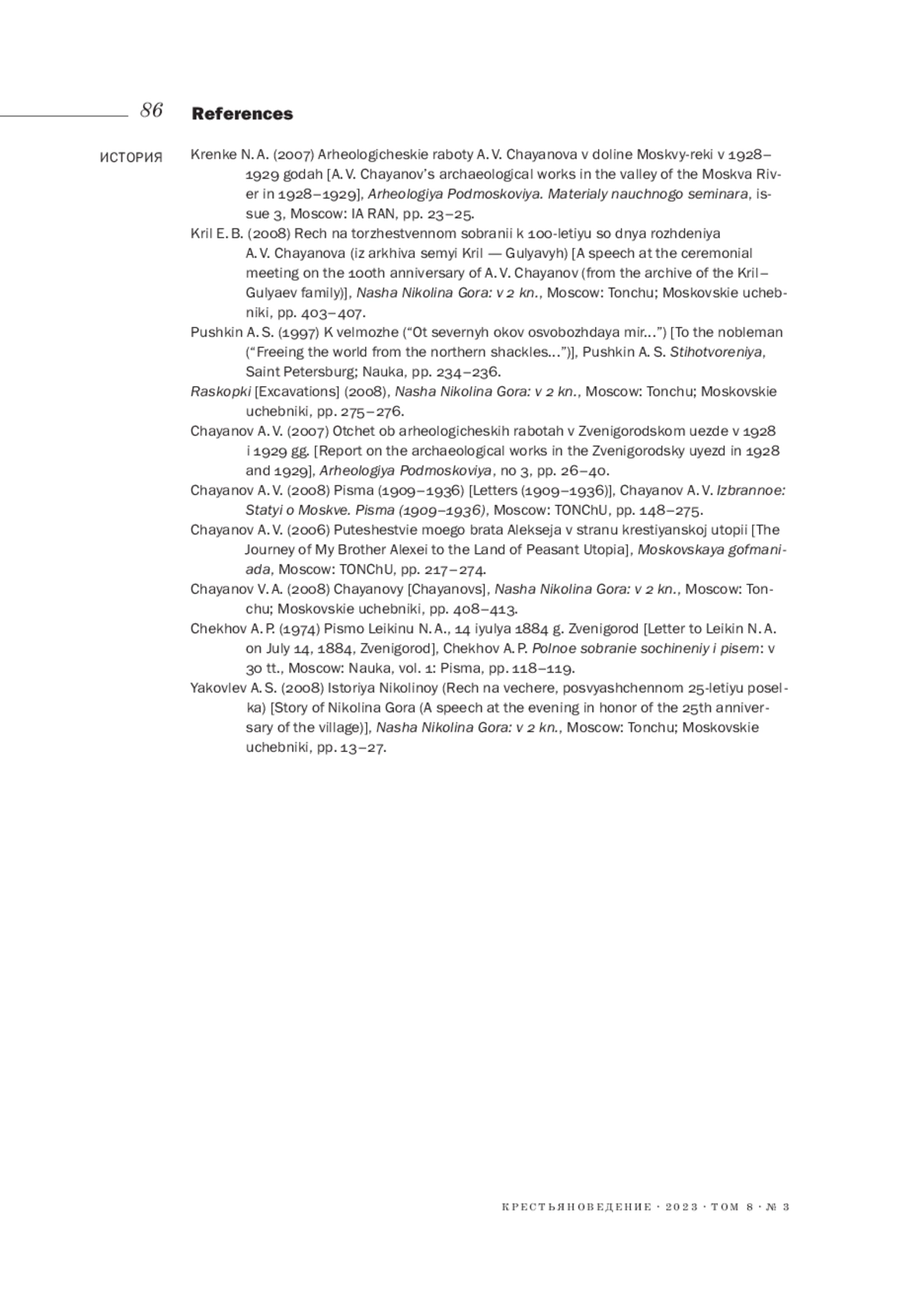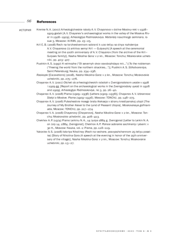 1. Кренке Н. А. (2007). Археологические работы А. В. Чаянова в долине Москвы-реки в 1928-1929 годах // Археология Подмосковья. Материалы научного семинара. Вып. 3. М.: ИА РАН. С. 23-25. EDN: GQJZJK