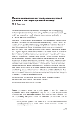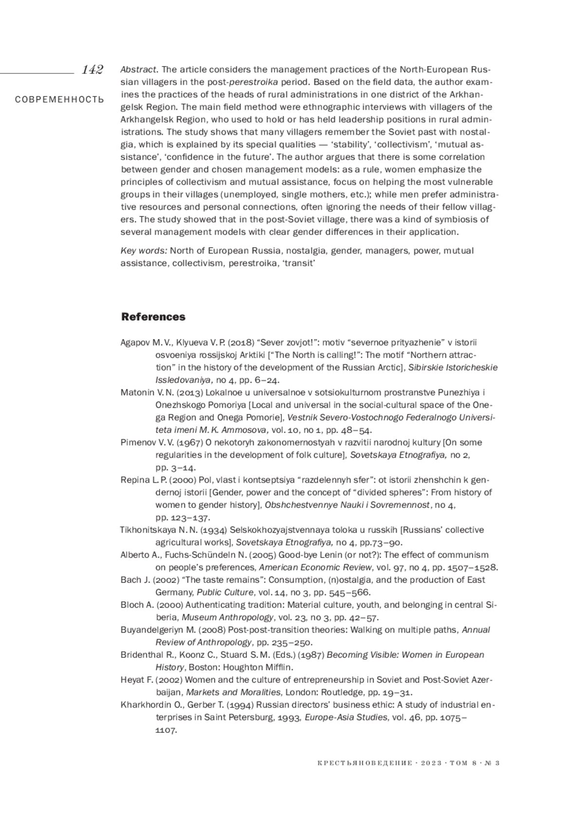Статья посвящена управленческим практикам жителей севернорусских деревень в постперестроечный период. На примере полевого этнологического материала автора были рассмотрены практики руководителей сельских администраций одного из районов Архангельской области. В качестве источника использованы этнографические интервью с жителями деревень Архангельской области, которые с 1990-х годов занимали или продолжают занимать руководящие должности в сельских администрациях. Как показали эти интервью, многие из жителей деревень Русского Севера с ностальгией вспоминают советские годы, наделяя это время особыми признаками, такими как «стабильность», «коллективизм», «взаимопомощь», «уверенность в будущем». Автор приходит к выводу о наличии некоторой корреляции между гендерной принадлежностью руководителя и теми моделями управления, которые он выбирает. Так, женщины в своей работе чаще апеллируют к принципам коллективизма и взаимопомощи, они акцентируют внимание на помощи тем, кого считают наиболее уязвимыми категориями населения в своих деревнях (безработные, матери-одиночки и проч.). Мужчины-управленцы выбирают иную модель работы: зачастую используют административный ресурс, подключают личные связи, при этом редко упоминают социальную помощь нуждающимся односельчанам. Исследование показало, что в постсоветской деревне произошел своеобразный симбиоз нескольких управленческих моделей, которые имеют гендерные особенности в своей реализации на практике.