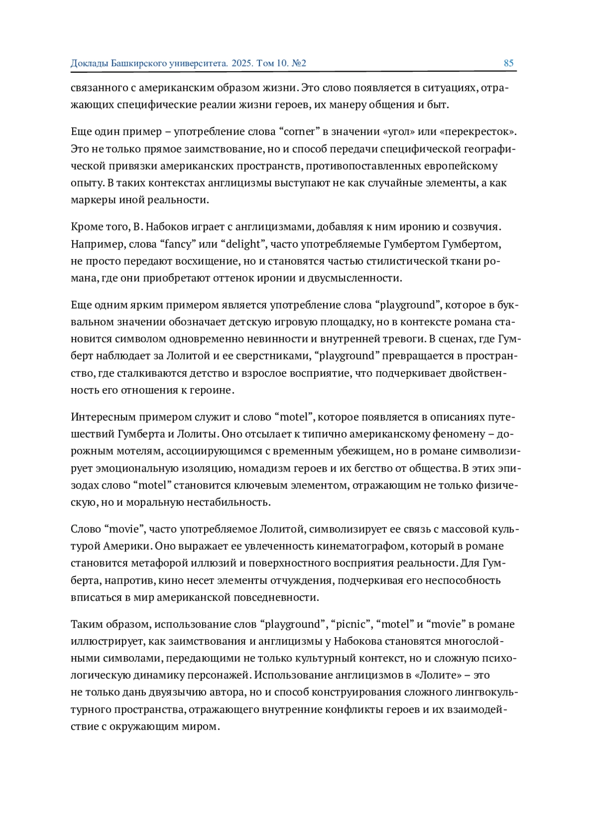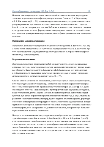 Творчество Владимира Набокова занимает уникальное место в мировой литературе, и оно привлекает внимание исследователей благодаря синтезу языковой игры, культурных аллюзий и богатства лексических средств [1]. Лингвокультурный код его произведений представляет собой сложный сплав литературных, национальных и языковых пластов, который служит ключом к интерпретации авторского замысла.