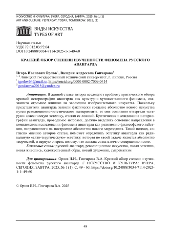 В данной статье авторы исследуют проблему критического обзора краткой историографии авангарда как культурно-художественного феномена, оказавшего огромное влияние на эволюцию изобразительного искусства. Поскольку представители авангарда заявили фактически создание абсолютно нового искусства путем революционно-эстетического эксперимента, то они осознанно отвергали «старую» классическую эстетику, считая ее ложной. Критическое исследование историографии авангарда, проводимое авторами, должно выделить основные направления в комплексном исследовании феномена авангарда как религиозно-философского действия, направленного на построение абсолютно нового мироздания. Такой подход, согласно мнению авторов статьи, поможет определить эстетику авангарда как радикальную «анти-теургическую» эстетику, которая по своей задаче является абсолютно творческой, в первую очередь потому, что должна создать нечто совершенно новое.