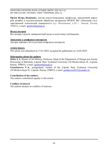 В работах отечественных искусствоведов отмечается, что многие современные дизайнеры обращаются в своем творчестве к конкретным этническим мотивам практически, перенося их в свои коллекции одежды. Результатом такого прямого цитирования может стать несоответствие кроя и декора, нарушение пластики силуэта, смешение разнородных стилей и концепций. В то же время отражение традиционного русского костюма в современном дизайне не только способствует увеличению числа коллекций модной одежды в этно-стиле, но и позволяет транслировать русские национальные духовные ценности в многополярном мире. Это является значимым на фоне утраты многими этническим культурами большинства характерных черт. Разработка модной коллекции на материале традиционного русского костюма является задачей, требующей изобретательского, инновационного решения. Уже на этапе проектирования коллекции в этно-стиле необходимы знания о традиционном русском костюме, способности трансформировать его в новые современные формы одежды, навыки декорирования костюма с помощью различных видов народного искусства. На конструкторско-технологическом этапе использование информационных технологий позволяет провести моделирование и построение лекал с использованием в качестве базы элементов формы и конструкции традиционного русского костюма. Авторами рассмотрены работы молодых дизайнеров, художников костюма, модельеров, которые демонстрируют высокую эффективность использования материала традиционного русского костюма в современном дизайне.
