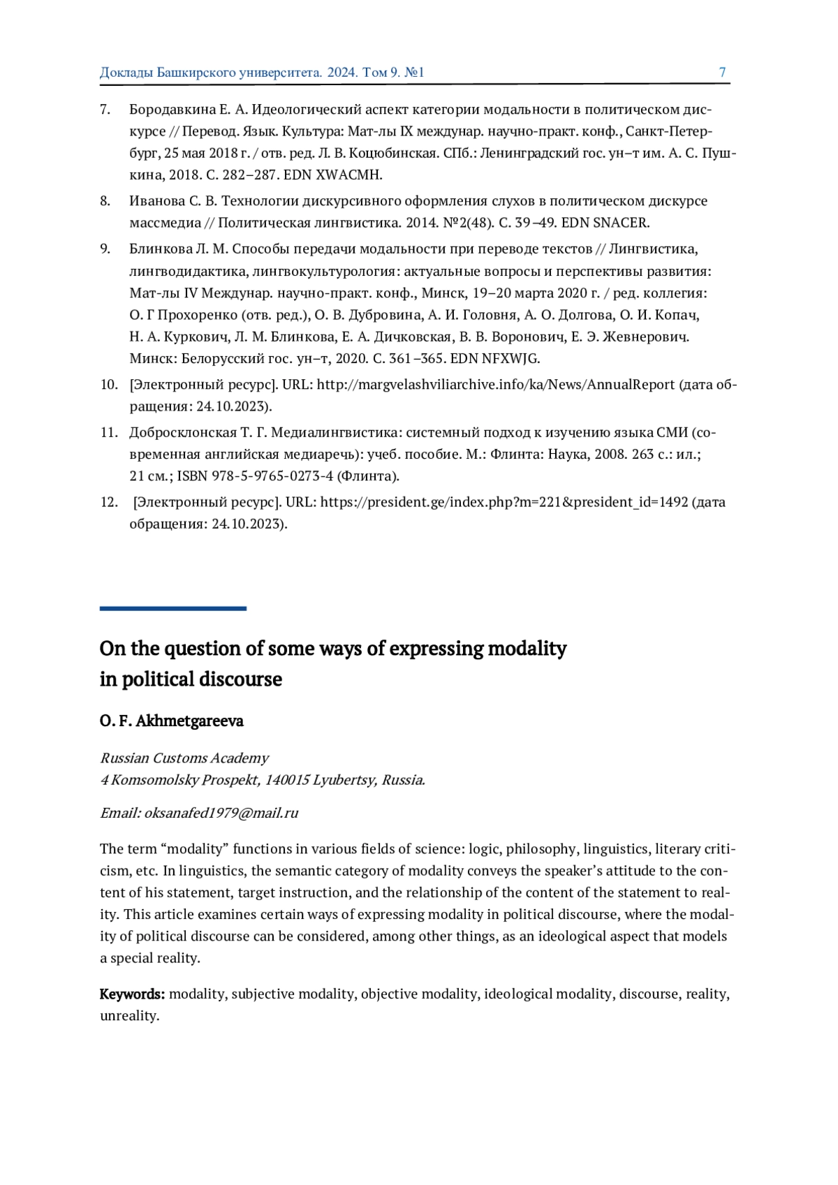 7. Бородавкина Е. А. Идеологический аспект категории модальности в политическом дискурсе // Перевод. Язык. Культура: Мат-лы IX междунар. научно-практ. конф., Санкт-Петербург, 25 мая 2018 г. / отв. ред. Л. В. Коцюбинская. СПб.: Ленинградский гос. ун-т им. А. С. Пушкина, 2018. С. 282-287. EDN: XWACMH