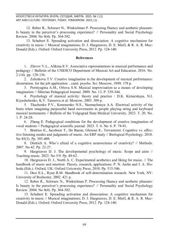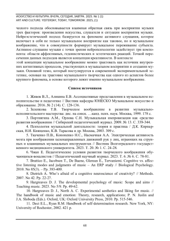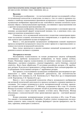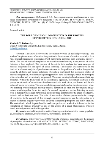 Статья посвящена актуальной проблеме музыкальной психологии - изучению феномена музыкального воображения в структуре музыкального творчества. Как правило, музыкальное воображение ассоциировано с музыкальной импровизацией. Наименее исследована область музыкального воображения как активной психической деятельности в процессе активного слушания. Цель статьи заключается в анализе основных концепций музыкального воображения в аспекте активного слушания. Исследование осуществлялось на основе релевантного анализа публикаций, посвященных проблеме музыкального воображения, по базам данных eLibrary, Scopus. В статье было установлено, что в современных исследованиях музыкального воображения оформились два методологических подхода, которые и конкурируют друг с другом, и взаимно пересекаются. Это социологический и нейроэстетический подходы. В рамках социологического подхода обосновывается взаимная обратная связь при восприятии музыки трех факторов: произведения искусства, слушателя и ситуации восприятия музыки. Нейроэстетический подход базируется на феномене активного слушания, которое включает в себя не только музыкальное восприятие как таковое, но и музыкальное воображение, что в совокупности формирует музыкальное переживание субъекта. Активное слушание музыки с точки зрения нейропсихологии задействует три компонента: области аффективных, гедонистических и эстетических реакций. Точкой пересечения данных подходов является концепция креативности. В контексте этой концепции музыкальное воображение можно трактовать как источник внутренних когнитивных процессов, участвующих в музыкальном восприятии и создании музыки. Основной тезис, который постулируется в современной экспериментальной эстетике, базируется на трактовке музыкального творчества как одного из аспектов более крупного феномена, в основе которого лежит именно музыкальное воображение.