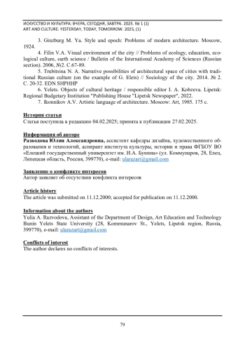 5. Трубицина Н.А. Нарративные возможности архитектурного пространства городов с традиционной русской культурой (на примере Г. Ельца) // Социология города. 2014. № 2. С. 20-32.