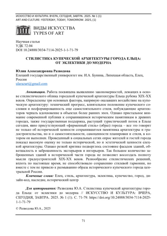 Работа посвящена выявлению закономерностей, лежащих в основе стилистического облика городской купеческой архитектуры Ельца рубежа XIX-XX веков. Определены три основных фактора, напрямую оказавших воздействие на купеческую архитектуру: технический прогресс, влиятельное положение купеческого сословия и несформированность еще самостоятельного стиля, побуждающие архитекторов черпать вдохновение в объектах более ранних эпох. Однако пристальное внимание современной публики к сохранившимся историческим памятникам в древних городах, также государственная поддержка, растущий туристический поток в Ельце сегодня, явно присутствующий «фирменный стиль» (образ) города - все это говорит не только об исторической ценности сохранившегося памятника архитектуры и градостроительства, но и о самостоятельности, самоценности планировки и стиля, в котором он выполнен. Проведенный в социальных сетях опрос жителей и гостей города показал высокую оценку не только исторической, но и эстетической ценности елецкой архитектуры. Однако резкой критике подверглось состояние фасадов зданий, обветшалость и заброшенность экстерьеров и интерьеров. Так большое количество заброшенных зданий в исторической части города не позволяет воссоздать полноту мысли градоустроителей XIX-XX веков. Разнообразие стилистических решений, вплоть по настоящее время, не способствовало сохранению стилевой гармонии, но вместе с тем не привело к размыванию образа исторического купеческого города центральной России.