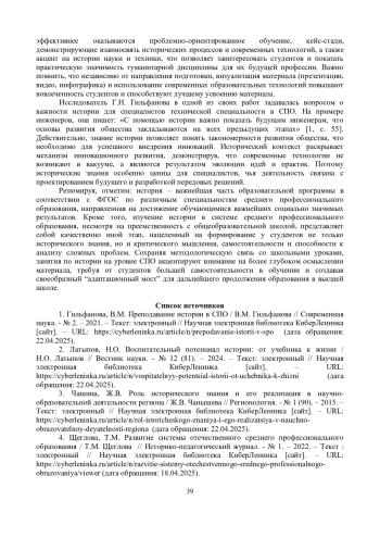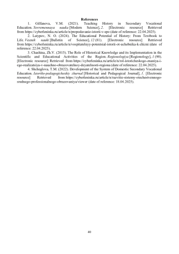 1. Гильфанова, В.М. Преподавание истории в СПО / В.М. Гильфанова // Современная наука. - № 2. - 2021. - Текст: электронный // Научная электронная библиотека КиберЛенинка [сайт]. - URL: https://cyberleninka.ru/article/n/prepodavanie-istorii-v-spo (дата обращения: 22.04.2025).
