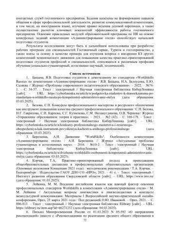 1. Бацына, Я.В. Подготовка студентов к демоэкзамену по стандартам “Worldskills Russia” по компетенции “Администрирование отеля” / Я.В. Бацына, Н.А. Белоусова, Е.Ю. Саляева // Журнал “Проблемы современного педагогического образования”. - 2022. - №74-1. - С. 34-37. - Текст: электронный // Научная электронная библиотека КиберЛенинка [сайт]. - URL: https://cyberleninka.ru/article/n/podgotovka-studentov-k-demoekzamenu-po-standartam-worldskills-russia-po-kompetentsii-administrirovanie-otelya (дата обращения: 03.03.2025).