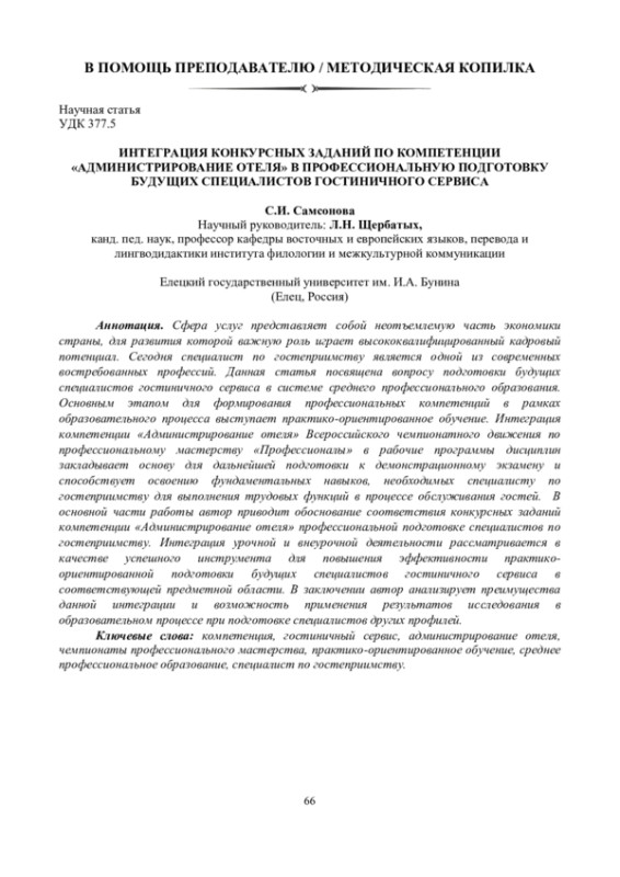 Сфера услуг представляет собой неотъемлемую часть экономики страны, для развития которой важную роль играет высококвалифицированный кадровый потенциал. Сегодня специалист по гостеприимству является одной из современных востребованных профессий. Данная статья посвящена вопросу подготовки будущих специалистов гостиничного сервиса в системе среднего профессионального образования. Основным этапом для формирования профессиональных компетенций в рамках образовательного процесса выступает практико-ориентированное обучение. Интеграция компетенции «Администрирование отеля» Всероссийского чемпионатного движения по профессиональному мастерству «Профессионалы» в рабочие программы дисциплин закладывает основу для дальнейшей подготовки к демонстрационному экзамену и способствует освоению фундаментальных навыков, необходимых специалисту по гостеприимству для выполнения трудовых функций в процессе обслуживания гостей. В основной части работы автор приводит обоснование соответствия конкурсных заданий компетенции «Администрирование отеля» профессиональной подготовке специалистов по гостеприимству. Интеграция урочной и внеурочной деятельности рассматривается в качестве успешного инструмента для повышения эффективности практико-ориентированной подготовки будущих специалистов гостиничного сервиса в соответствующей предметной области. В заключении автор анализирует преимущества данной интеграции и возможность применения результатов исследования в образовательном процессе при подготовке специалистов других профилей.