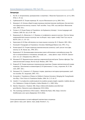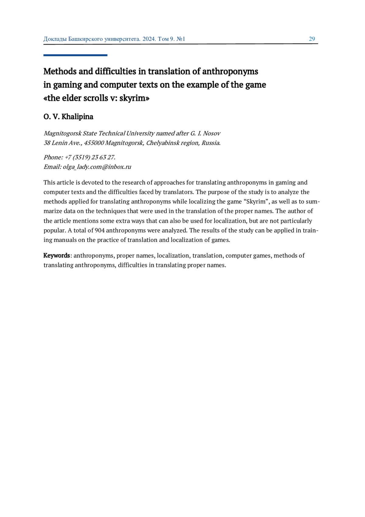 ХАЛИПИНА О. В. МЕТОДЫ И СЛОЖНОСТИ ПЕРЕВОДА АНТРОПОНИМОВ В ТЕКСТАХ ИГРОВОЙ И КОМПЬЮТЕРНОЙ НАПРАВЛЕННОСТИ НА ПРИМЕРЕ ИГРЫ "THE ELDER SCROLLS V: SKYRIM" // ДОКЛАДЫ БАШКИРСКОГО УНИВЕРСИТЕТА. 2024. Т. 9 № 1