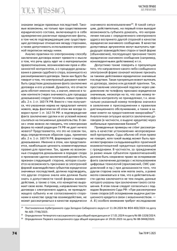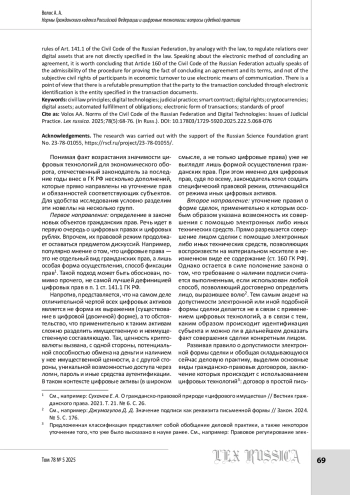 Автор формирует научно обоснованные выводы о направлениях развития судебной практики по вопросам применения недавно появившихся в ГК РФ норм, связанных с использованием цифровых технологий субъектами экономического оборота. В статье делается принципиальное заключение о том, что суды нередко используют рассматриваемые нормы не в том контексте, который имелся в виду при их создании. Практика по данным делам не может считаться сформированной, что, помимо прочего, подразумевает необходимость подготовки научно обоснованных разъяснений на уровне Верховного Суда РФ. Среди наиболее сложных остается вопрос о возможности применения ст. 141.1 ГК РФ по аналогии для регулирования отношений по поводу цифровых активов, прямо в законе не указанных. Рассуждая об электронном способе заключения договора, сто́ит сделать вывод о том, что статья 160 ГК РФ говорит о допустимости процедуры доказывания факта заключения договора и его условий, а не о субъективных гражданских правах участников экономического оборота на использование электронных средств коммуникации. Складывается точка зрения о существовании опровержимой презумпции того, что стороной сделки, заключенной посредством электронной идентификации, является тот субъект, который указан в документах о сделке.