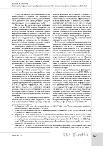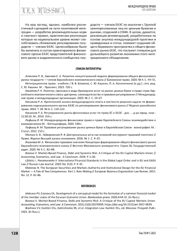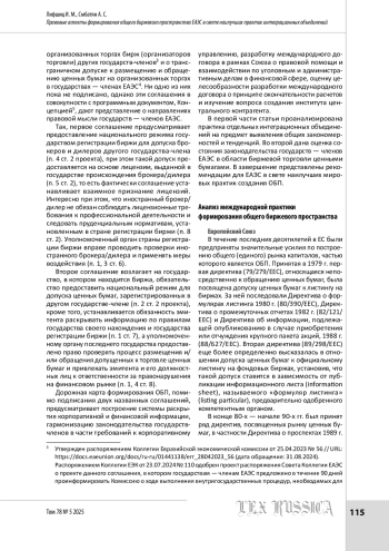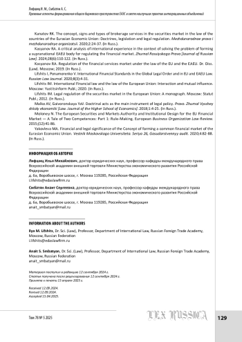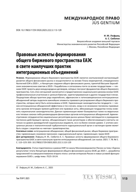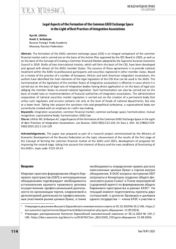 Формирование общего биржевого пространства ЕАЭС является неотъемлемой составляющей развития общего финансового рынка и осуществляется на основе Плана мероприятий, утвержденного Коллегией ЕЭК в 2020 г., и Концепции создания общего финансового рынка, принятой Высшим Евразийским экономическим советом в 2019 г. Разработаны и согласованы почти со всеми государствами — членами ЕАЭС проекты двух международных договоров, которые послужат фундаментом общего биржевого пространства. Суть этих соглашений заключается в предоставлении национального режима внутри ЕАЭС профессиональным участникам и ценным бумагам, зарегистрированным в других государствах-членах. Посредством обзора практики ряда европейских, африканских и латиноамериканских интеграционных объединений авторы выделили важнейшие элементы правового регулирования общего биржевого пространства, которые могут быть использованы в ЕАЭС. Гармонизация законодательства государств — членов интеграционных объединений эффективна в тех случаях, когда в ее основание положены правовые акты органов интеграции прямого действия или правовые акты, обязывающие государства-члены изменить национальное законодательство. Данная гармонизация может базироваться также на модельных или типовых законах либо рекомендациях финансовых органов интеграционных объединений. Административное сотрудничество национальных регуляторов рынка ценных бумаг воплощается в учреждании постоянно действующего органа, объединяющего таких регуляторов и обеспечивающего контакты не только на уровне руководителей национальных ведомств, но и на более низком уровне. С учетом санкционных рисков и геополитической турбулентности наднациональный орган в настоящее время может быть создан c акцентом на «мягкое» правотворчество.