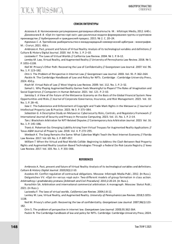 15. Tan J. Blockchain Arbitration for NFT-Related Disputes // Contemporary Asia Arbitration Journal. 2023. Vol. 16. No. 1. P. 145-186.