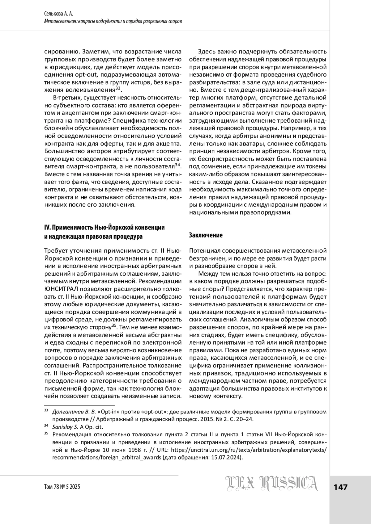 В статье рассматриваются юрисдикционные аспекты разрешения споров, возникающих в метавселенной — цифровом мире, ключевые особенности которого включают в себя: использование иммерсивных технологий (виртуальная реальность); представление пользователей через аватары; проведение транзакций с помощью блокчейна; существование централизованных и децентрализованных платформ; наличие в коммерческом обороте нематериализованных активов и NFT. Автор приводит классификацию споров, которые могут возникнуть в метавселенной: споры между пользователями и операторами платформ; споры между пользователями; споры по поводу интеллектуальной собственности. В первой категории автор особенно выделяет правовые конфликты, касающиеся виртуальной недвижимости, а также споры по поводу персональных данных пользователей платформ, операторы которых не могут гарантировать защиту от хакерских атак. Касательно споров между пользователями автор отмечает, что многие из них связаны с отсутствием в метавселенной какого-либо контроля за оказанием виртуальных услуг, созданием цифровых активов и совершением транзакций. Обращаясь к вопросу о применимом праве и подсудности, автор указывает, что в большинстве случаев соответствующие положения включаются в пользовательские соглашения отдельных платформ и не подлежат изменению. В статье рассмотрены три инструмента разрешения споров, возникающих в метавселенной: «традиционный» — в государственных судах или в рамках арбитража; «модифицированный», где правила судопроизводства адаптируются к специфике виртуальных правоотношений, и «децентрализованный» — в рамках онлайн-урегулирования споров, сочетающий в себе элементы блокчейна, краудсорсинга и искусственного интеллекта.