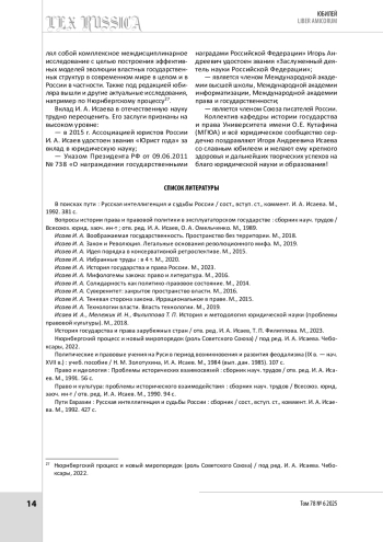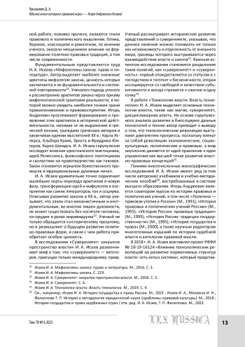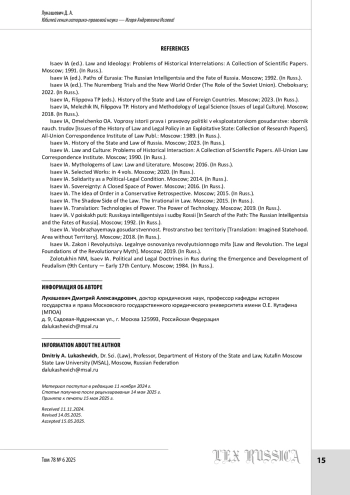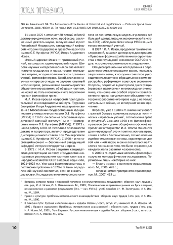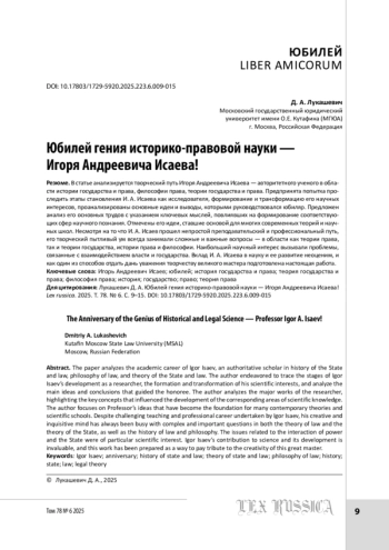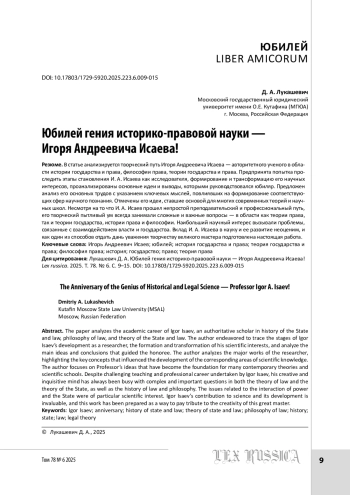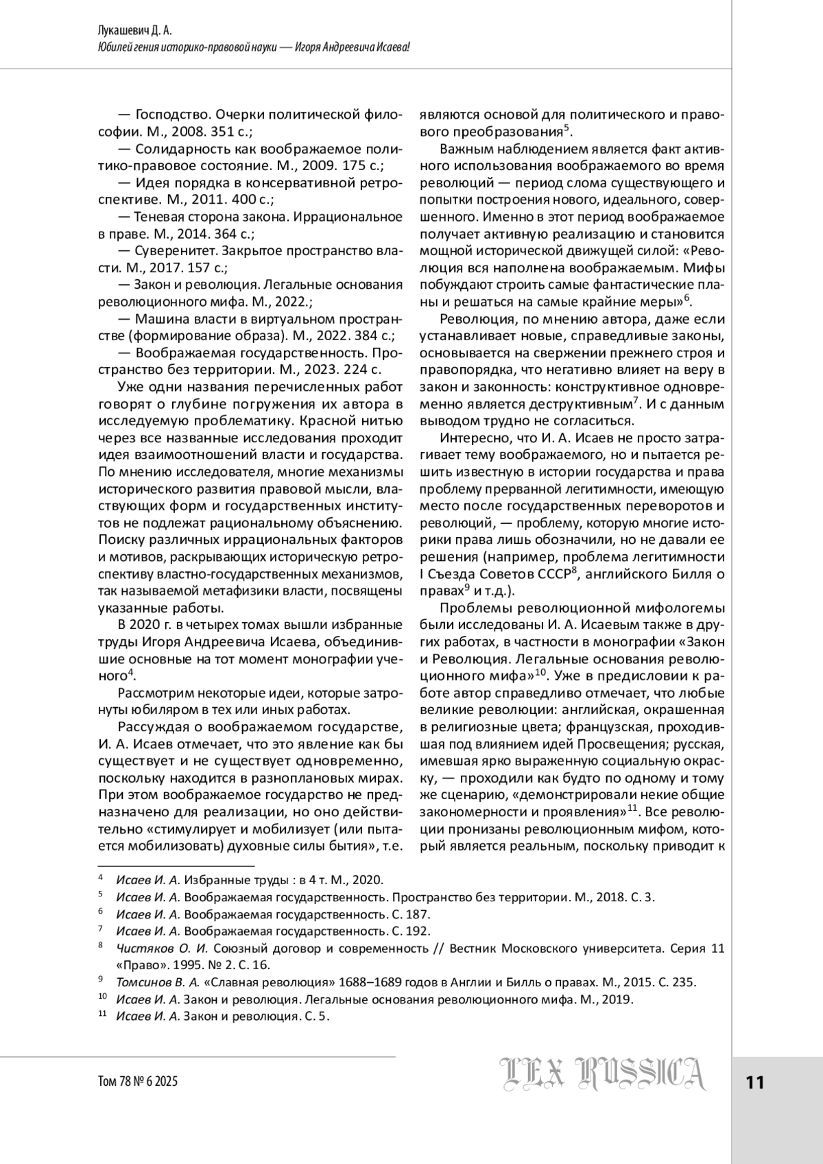 ЛУКАШЕВИЧ Д. А. ЮБИЛЕЙ ГЕНИЯ ИСТОРИКО-ПРАВОВОЙ НАУКИ — ИГОРЯ АНДРЕЕВИЧА ИСАЕВА! // LEX RUSSICA (РУССКИЙ ЗАКОН). 2025. ТОМ 78, № 6