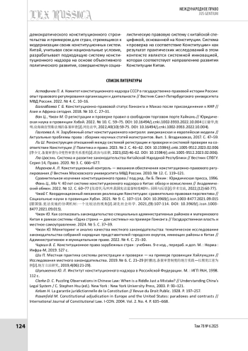10. Чжай Г. Координационный механизм реализации Конституции: сравнительно-правовая перспектива // Социальные науки в провинции Хубэя. 2021. № 9. С. 107-114. https://doi.org/10.3969/j.issn.1003-8477.2021.09.015 (翟国强.宪法实施的协调机制:一个比较法的视角[J].湖北社会科学. 2021,(9):107-114. https://doi.org/10.3969/j.issn.1003-8477.2021.09.015).