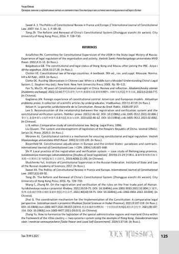 9. Фань Ц., Ма Ч. 40 лет системе конституционного надзора в Китае: обзор и осмысление // Академический обмен. 2022. № 12. С. 60-77 (范进学,马冲冲.我国宪法监督制度40年:回顾与反思[J].学术交流, 2022,(12):60-77).