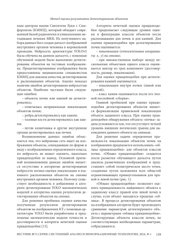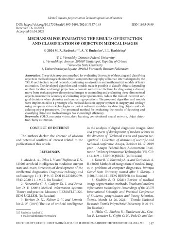 В статье предлагается метод оценки результатов детектирования и классификации объектов на медицинских изображениях, полученных по результатам компьютерной томографии внутренних органов человека нейросетью архитектуры YOLO, содержащий алгоритм и математические модели нечеткой оценки. Разработанные алгоритм и модели позволяют классифицировать объекты в зависимости от их расположения и проекции изображения, автоматизировать и сократить время диагностирования заболевания, перейти от оценки двумерных изображений к сборке и оценке трехмерных объектов, повысить точность оценки параметров объектов, снизить риски неправильных хирургических решений при планировании и проведении операций. Предложенные алгоритм и модели были реализованы в прототипе системы поддержки принятия врачебных решений в хирургии и урологии с использованием технологий компьютерного зрения в составе программных модулей по детектированию объектов и расчету параметров объектов. Представленный метод оценки результатов детектирования и классификации объектов на медицинских изображениях показал высокую эффективность.