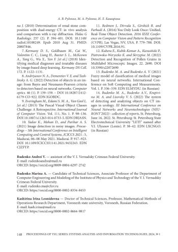 14. Система детектирования и анализа объектов на КТ-снимках в урологии / М. А. Руденко, А. В. Руденко, М. А. Крапивина, В. С. Лисовский // III Международная конференция по нейронным сетям и нейротехнологиям (NEURONT’2022): сборник докладов, Санкт-Петербург, 16 июня 2022 г. -Санкт-Петербург: Санкт-Петербургский государственный электротехнический университет “ЛЭТИ” им. В. И. Ульянова (Ленина), 2022. - С. 38-42. EDN: LXCNGO