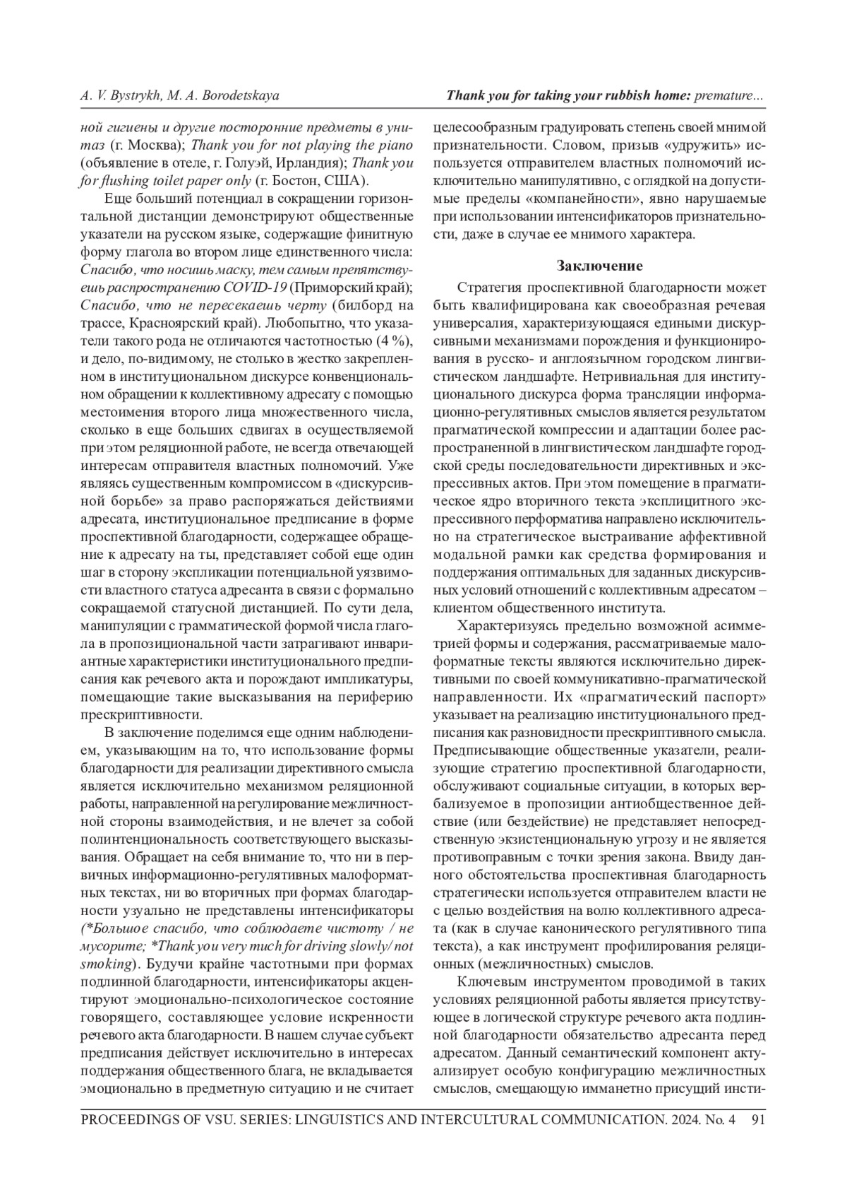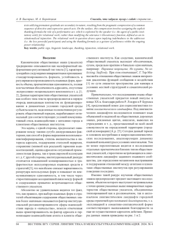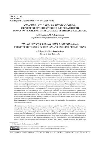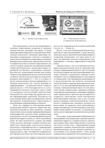 Стратегия проспективной благодарности рассматривается как речевая универсалия, используемая в лингвистическом ландшафте городской среды в качестве оптимального инструмента предотвращения антиобщественного поведения, не связанного с экзистенциональной угрозой и не являющегося в строгом смысле слова противоправным. Регулятивные тексты общественных указателей, эксплуатирующие данную стратегию, демонстрируют отклонение от канонических норм институционального дискурса и обнаруживают схожую коммуникативно-функциональную направленность, а также единые дискурсивные механизмы реализации в русском и английском языках, что может свидетельствовать об универсальности данной дискурсивной практики в сфере взаимодействия агентов и клиентов общественных институтов. Сложная дискурсивная природа исследуемых малоформатных текстов обусловливает интерпретативный подход к их анализу, опирающийся на функционально-прагматический метод, метод качественного контент- и контекстуального анализа, позволяющие адекватно описать опыт оперирования данной конвенцией русско- и англоязычными пользователями городской инфраструктуры. Полученные данные свидетельствуют, что проспективная благодарность как дискурсивная стратегия является результатом прагматической компрессии более распространенной в городском лингвистическом ландшафте последовательности директивных и экспрессивных актов. При этом помещаемая в прагматическое ядро вторичного текста форма эксплицитной благодарности является исключительно стратегическим средством конструирования особой конфигурации межличностных смыслов и никак не затрагивает его иллокутивную цель, определяемую в работе как институциональное предписание. Осуществляемая таким образом реляционная работа связана с актуализацией компонента логической структуры речевого акта благодарности - «признание обязательства перед адресатом», что позволяет агенту социального института манипулировать властным дифференциалом как неотъемлемым параметром статусно ориентированного общения.