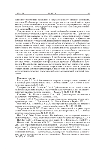 1. Багдасарян В.Э. 2020. Когнитивные матрицы манипулятивных технологий в войнах и революциях нового типа. - Вестник МГОУ. Сер. История и политические науки. № 1. С. 8-23.