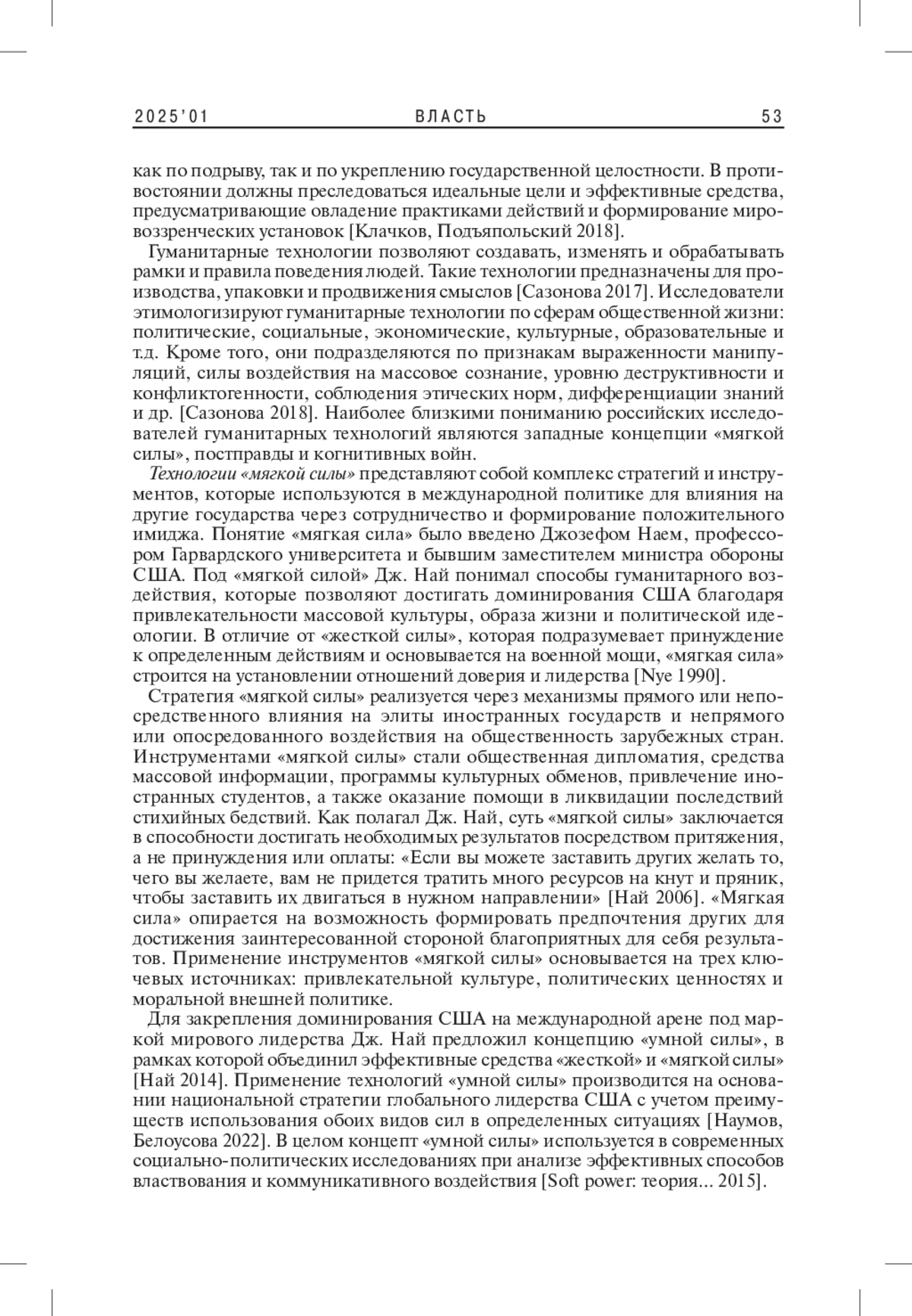9. Наумов А.О., Белоусова М.В. 2022. Эволюция концепции “мягкой силы” Дж. Ная: от рождения идеи до наших дней. - Вестник Московского университета. Сер. 21. Управление (государство и общество). № 2. С. 3-23.