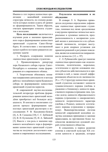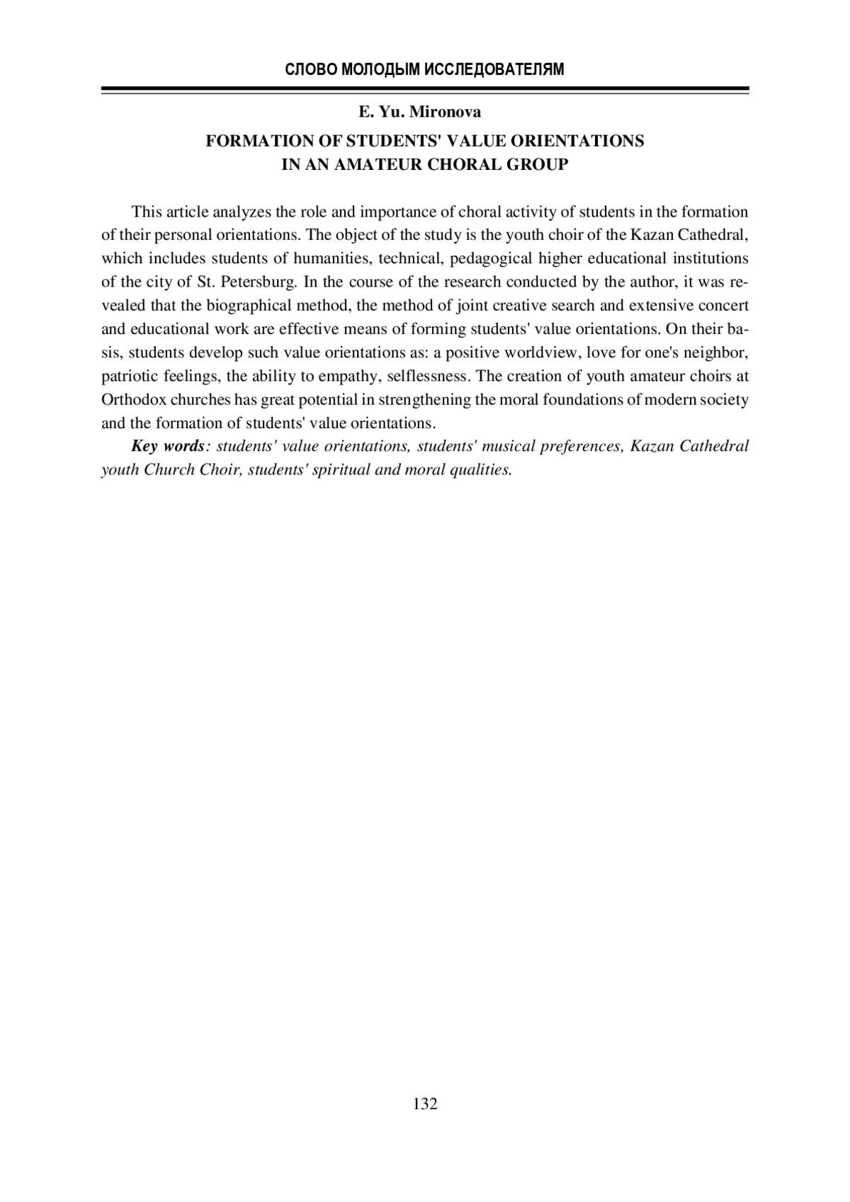 В данной статье анализируются роль и значение хоровой деятельности студентов в формировании их личностных ориентаций. В результате исследования было выявлено, что основными формами организации воспитательной и просветительской работы с хором являются хоровые репетиции, дискуссии по духовно-нравственной проблематике, конференции, посвящённые вопросам духовных ценностей, транслируемым в хоровой музыке, концерты хора, благотворительные проекты, беседы с духовными наставниками. На их основе у студентов формируются такие ценностные ориентации, как позитивное мировосприятие, любовь к ближнему, патриотические чувства, способность к эмпатии, бескорыстность. В создании молодежных любительских хоров при православных храмах видится большой потенциал в укреплении нравственных основ современного общества и формировании ценностных ориентаций студентов.