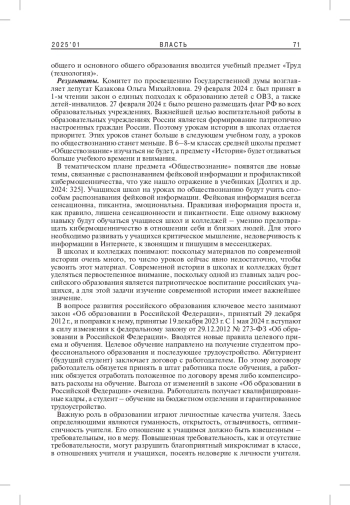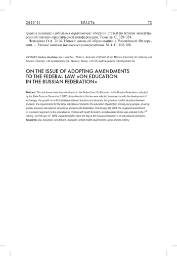 В данной статье проводится исследование поправок к федеральному закону «Об образовании в Российской Федерации», принятых Государственной думой 6 декабря 2023 г. Поправки к данному закону были приняты в связи с развитием технологий, ростом конфликтных ситуаций между педагогами и учащимися, ростом конфликтных ситуаций между учащимися, требованиями к трудовому воспитанию учащихся, воспитанию патриотизма в молодежной среде, обеспечению большего доступа к образовательным услугам для учащихся с ОВЗ. 29 февраля 2024 г. законопроект о единых подходах к образованию детей с ОВЗ, а также детей-инвалидов был принят в 1-м чтении. 27 февраля 2024 г. было решено размещать флаг РФ во всех образовательных учреждениях.