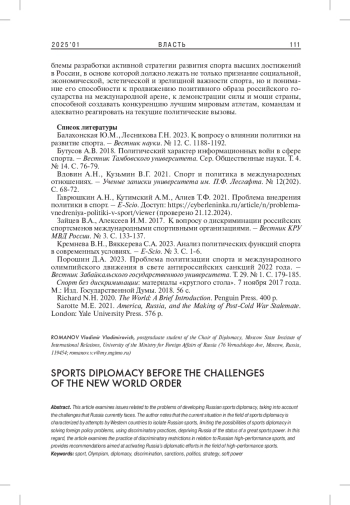 7. Порошин Д.А. 2023. Проблема политизации спорта и международного олимпийского движения в свете антироссийских санкций 2022 года. - Вестник Забайкальского государственного университета. Т. 29. № 1. С. 179-185. EDN: EGCKRJ