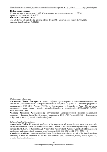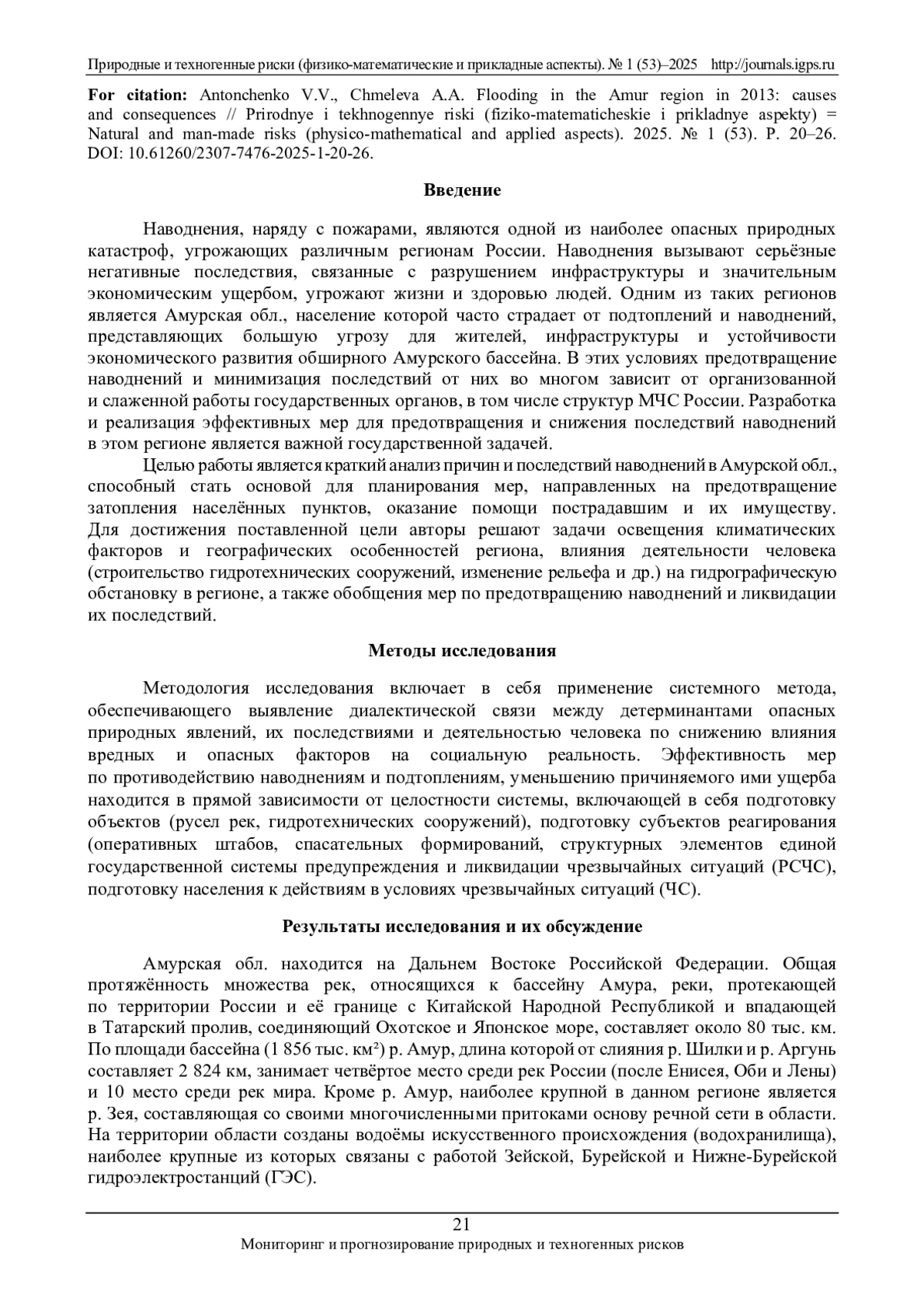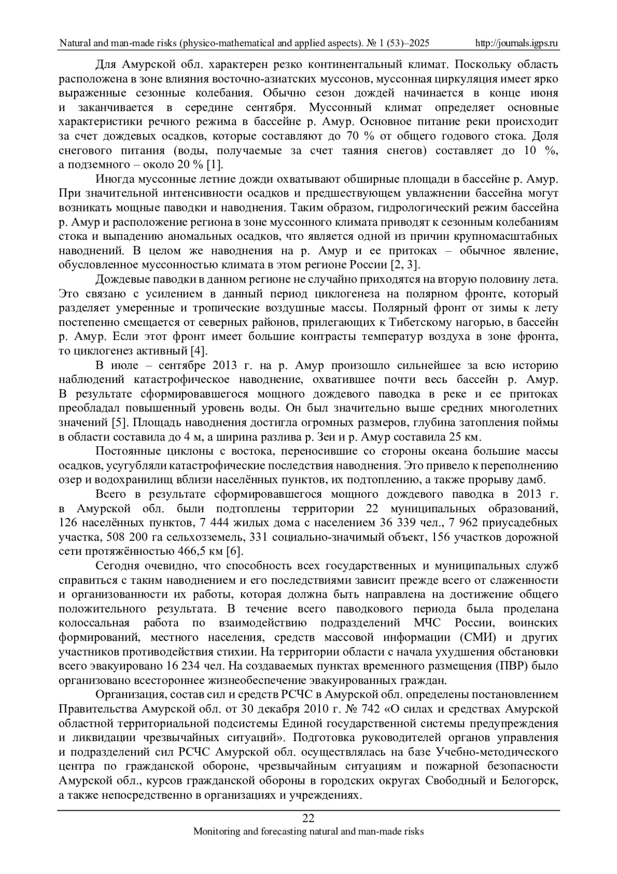 Рассмотрены причины наводнения в Амурской обл. в 2013 г. и действия органов власти, направленные на оказание помощи пострадавшему населению и организацию мер, способных ослабить негативные последствия от чрезвычайной ситуации. Рассматриваются климатические и географические факторы, способствующие возникновению паводков, включая влияние муссонных дождей и деятельность человека. Особое внимание уделено работе государственных служб, в частности МЧС России, в области ликвидации последствий наводнения, эвакуации населения и восстановления инфраструктуры. Рассматриваются меры по предотвращению подобных катастроф в будущем, включая инженерные решения, регулирование работы гидротехнических сооружений и улучшение системы информирования населения. Опыт борьбы с наводнением 2013 г. позволяет выработать эффективные стратегии для минимизации ущерба от подобных чрезвычайных ситуаций.
