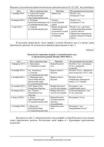 Рассматриваются проблемы, связанные с обеспечением безопасности населения при авариях с утечкой бытового газа, характерных для жилых домов Арктической зоны вследствие географических и климатических условий. Проведен анализ основных причин аварий с бытовым газом на территории России и сформулированы их особенности. Предлагаются пути усовершенствования мер безопасности посредством установки улучшенных газоанализаторов в квартирах с возможностью оповещения газовых охранных служб и жильцов, применения более совершенных технических средств тушения пожаров, способов ликвидации последствий разрушений и средств по экстренному спасению пострадавших из-под завалов при экстремально низких температурах воздуха.