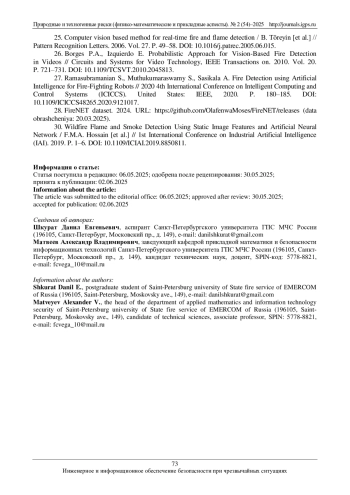 25. Computer vision based method for real-time fire and flame detection / B. Töreyin [et al.] // Pattern Recognition Letters. 2006. Vol. 27. P. 49–58. DOI: 10.1016/j.patrec.2005.06.015.