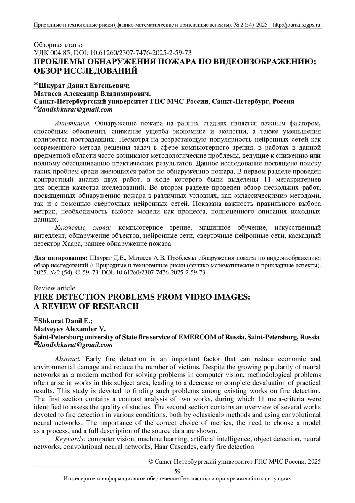 6. Kakde A., Arora N., Sharma D. Fire Detection System Using Artificial Intelligence Techniques // International Journal of Research in Engineering. 2018. Vol. 8. № 11. P. 1–5.