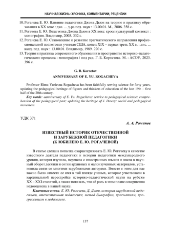23. Rogacheva E. John Dewey’s Educational Experiment and its Relevance for Future Teachers (from the Russian Perspective) // Why Should We Teach History of Education? / eds. K. Salimova, E. V. Yohanningmeier. International Academy of Self-Improvement, 1993. P. 165 - 175.