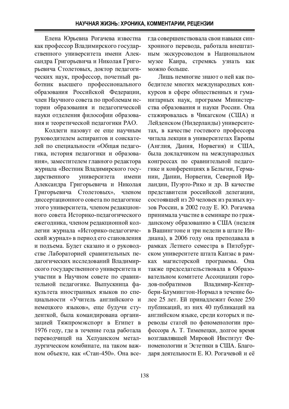 В статье сделана попытка охарактеризовать Е. Ю. Рогачеву в качестве известного деятеля педагогики и истории педагогики международного уровня, которая изучила, перевела с иностранных языков и ввела в научный оборот десятки и сотни архивных и малоизученных материалов, установила связи со многими зарубежными авторами. Вместе с этим для нас важно было отнести ее имя к той плеяде ученых, которые участвовали в кардинальной перестройке историко-педагогической науки на рубеже XX – XXI столетий, а также показать, что её роль в этом плане совершенно недооценена в нашей науке.